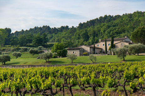 emprunte une longue allée qui chemine à travers les vignes et les oliviers. Nichée sur les hauteurs, la propriété offre une vue spectaculaire sur le domaine, les bois, la garrigue mais aussi